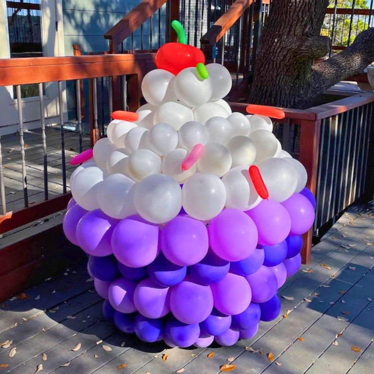 A delightful and whimsical balloon sculpture designed to resemble a giant cupcake, perfect for adding a sweet touch to any celebration. This eye-catching display features a cupcake base, colorful "frosting," and optional balloon accents like sprinkles, cherries, or candles.